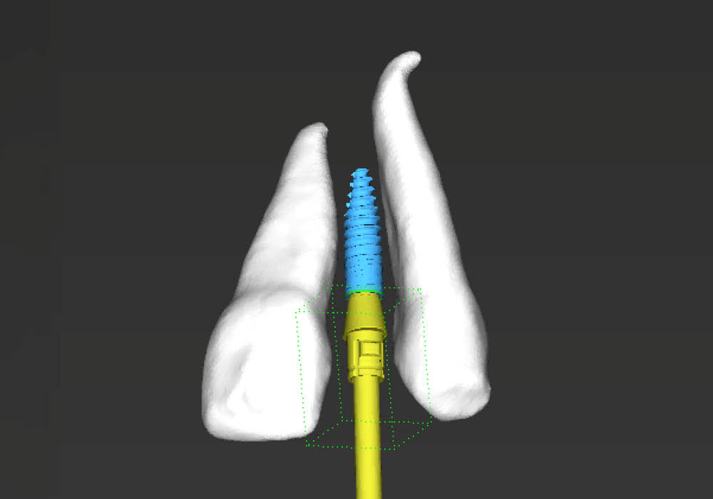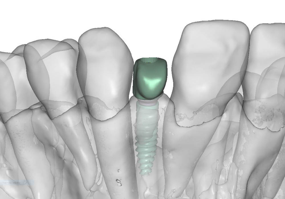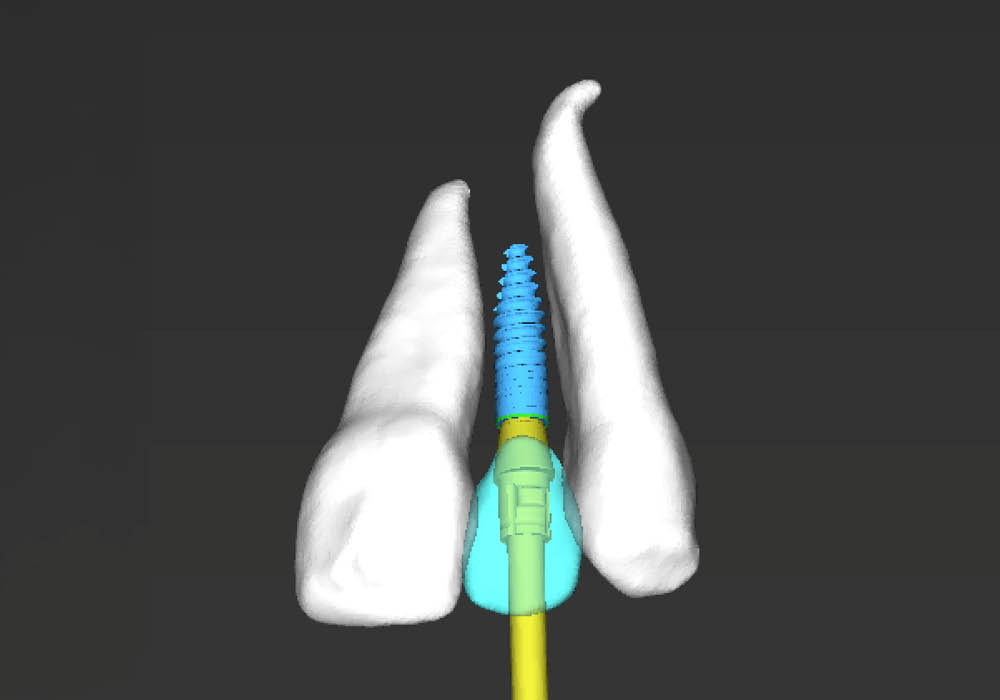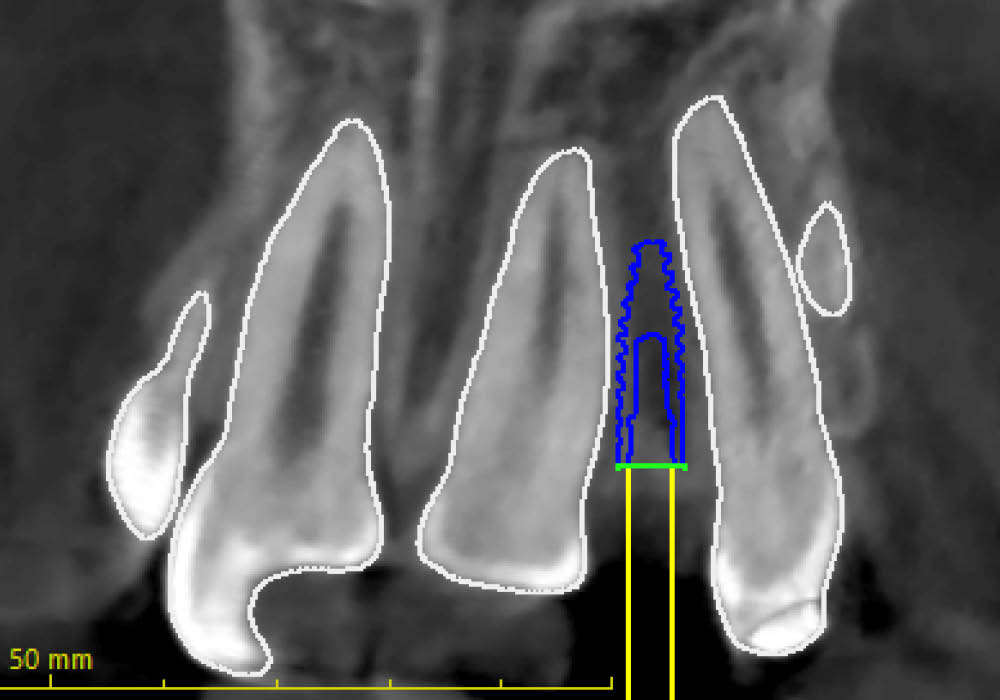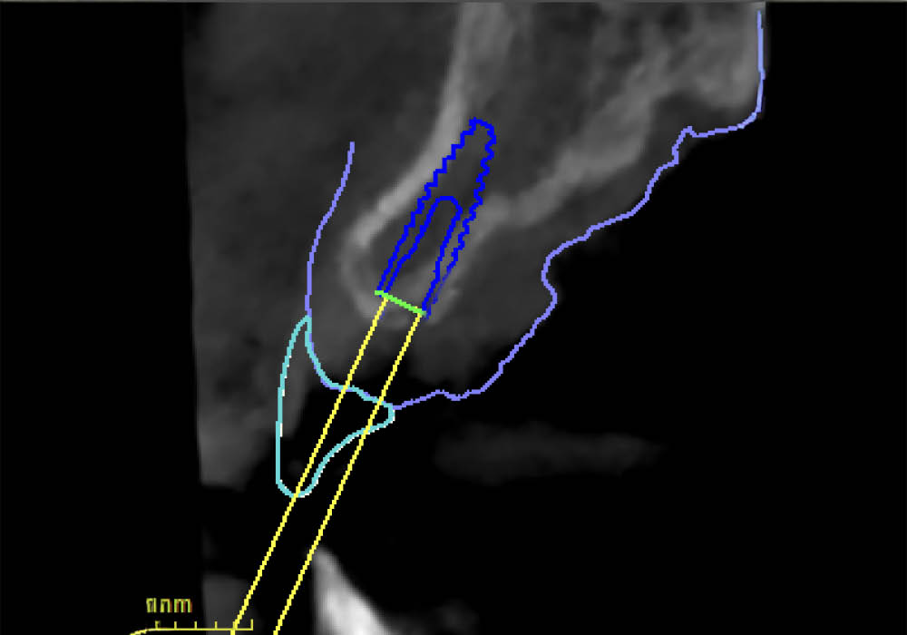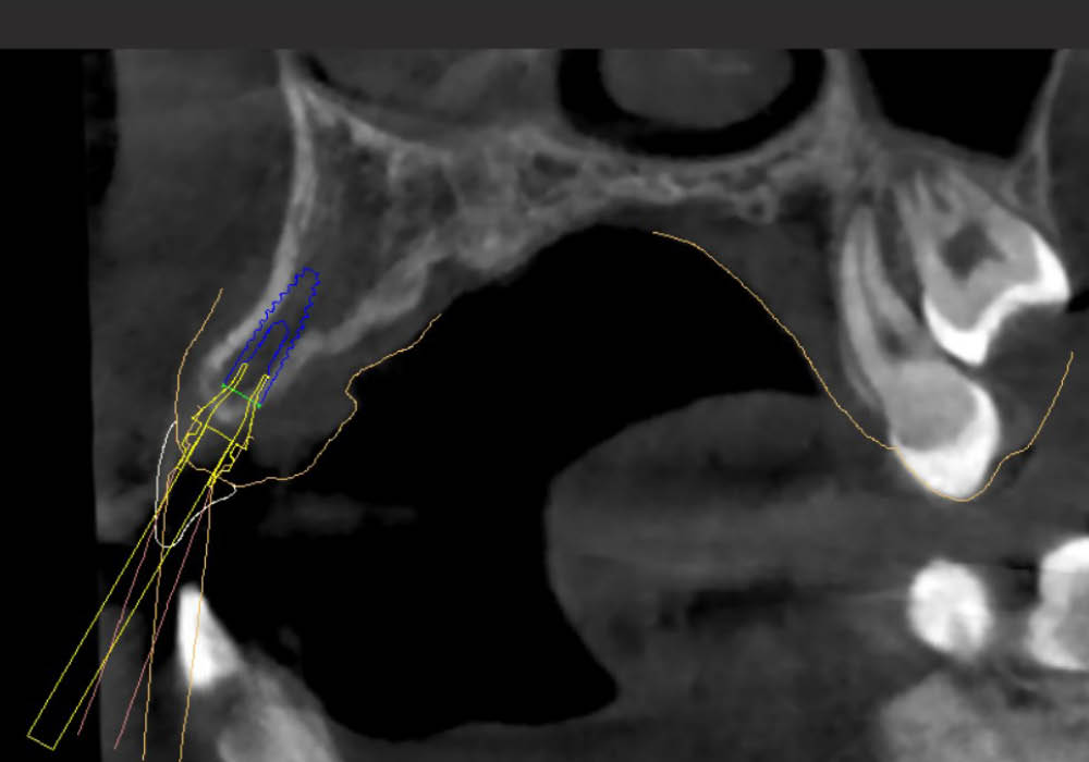 L’obiettivo era quello di definire con precisione posizione, profondità e inclinazione dell’impianto, tenendo conto della vicinanza delle radici adiacenti e della necessità di preservare un adeguato spessore vestibolare.