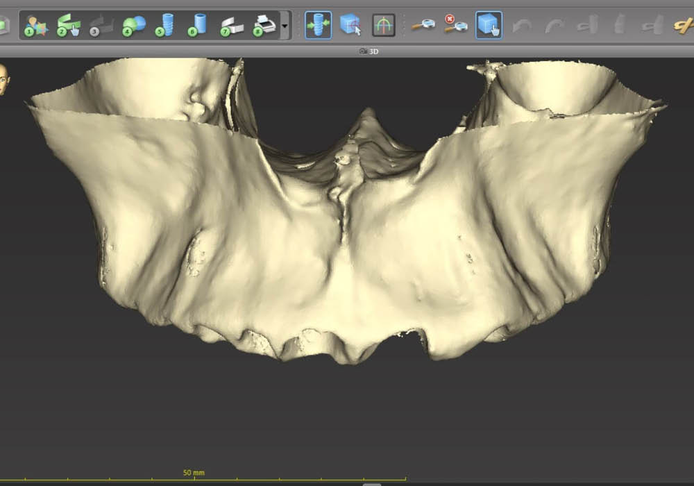 La pianificazione chirurgica ha previsto un’analisi tridimensionale dettagliata del sito implantare, valutato sia da angolazioni multiple sia in visione frontale diretta.